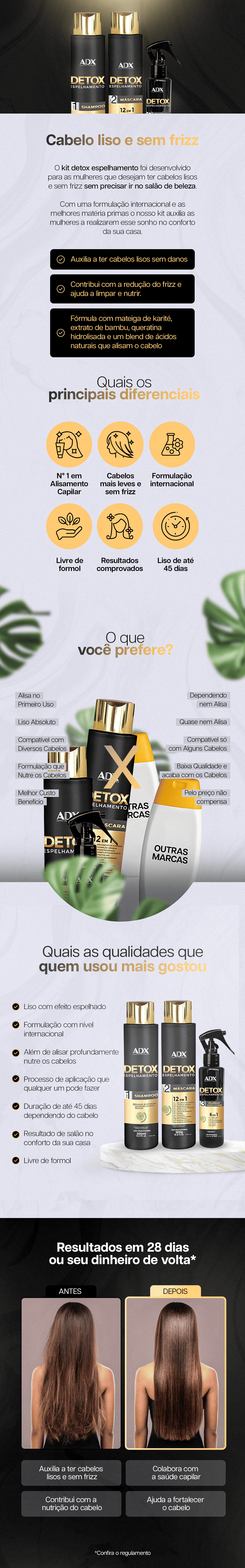 Estamos dedicados a assegurar sua satisfação e a resolver qualquer contratempo que possa surgir durante o uso do Kit Detox Espelhamento, por isso a ADX Cosméticos criou a campanha “Seu cabelo mais liso ou seu dinheiro de volta”. No tempo vigente da campanha, nós garantimos que o seu cabelo sairá mais liso ou você poderá pedir o seu dinheiro de volta.
